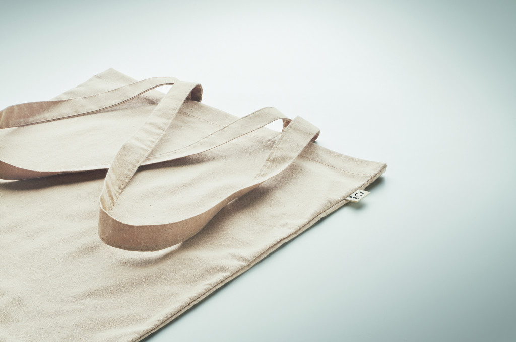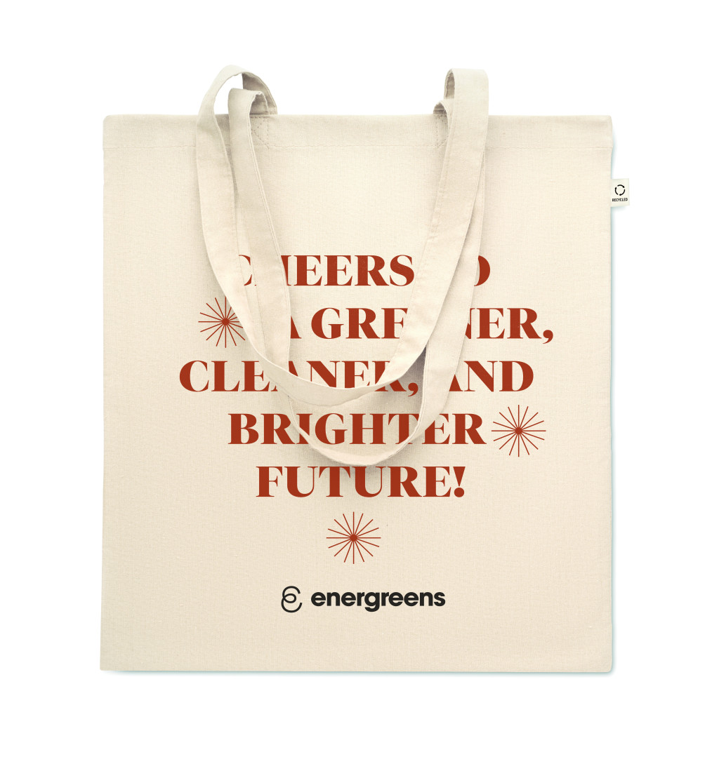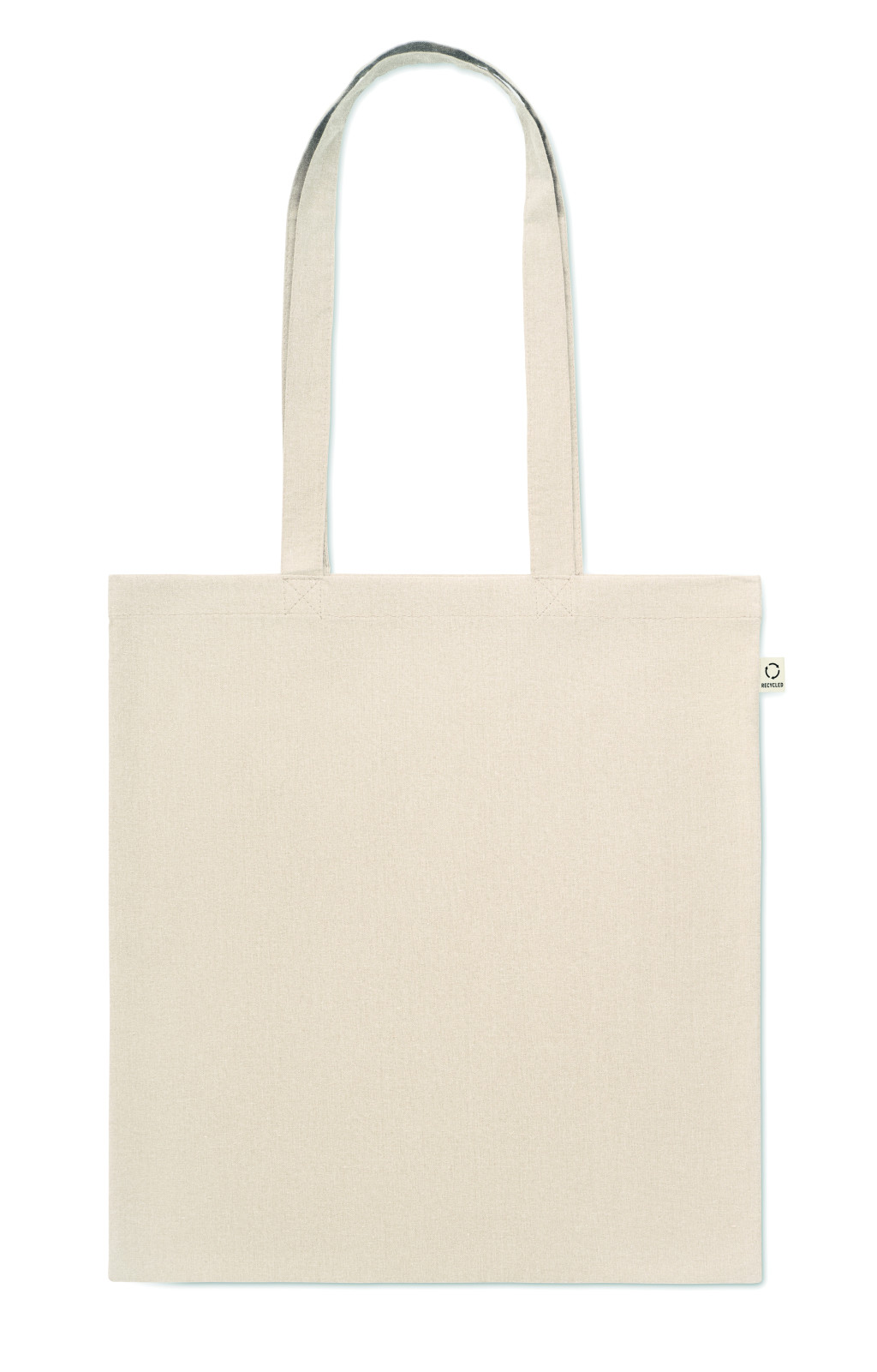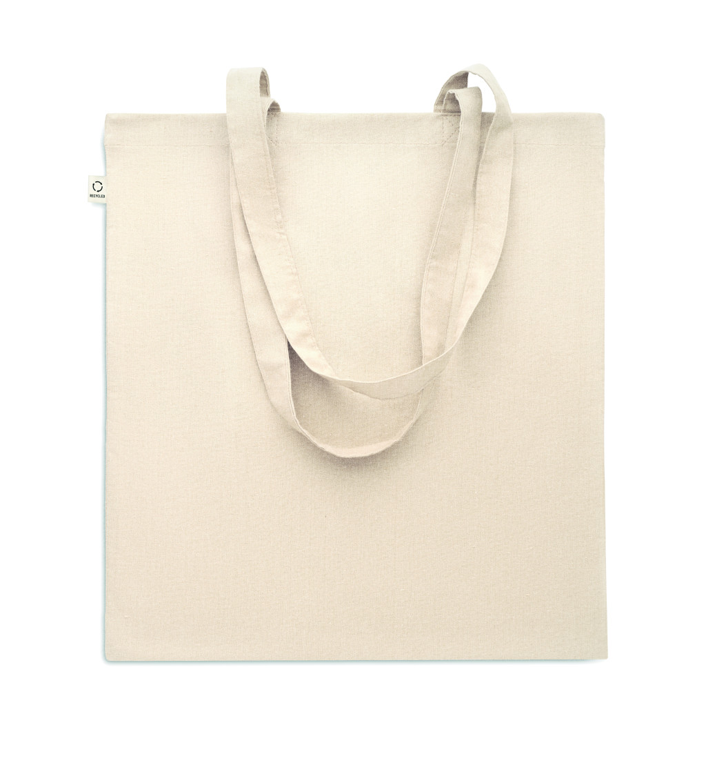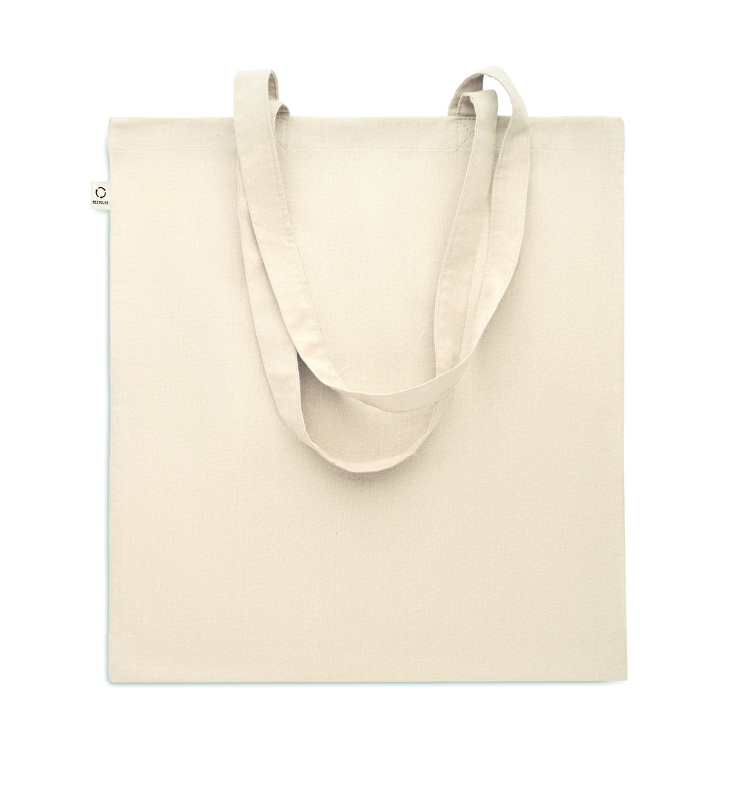 Fogyasztás előtti újrahasznosított pamut bevásárlótáska (70% újrahasznosított pamut és 30% RPET), hosszú fülekkel. 140 g/m². Ez az anyag nyomtatás után zsugorodhat.