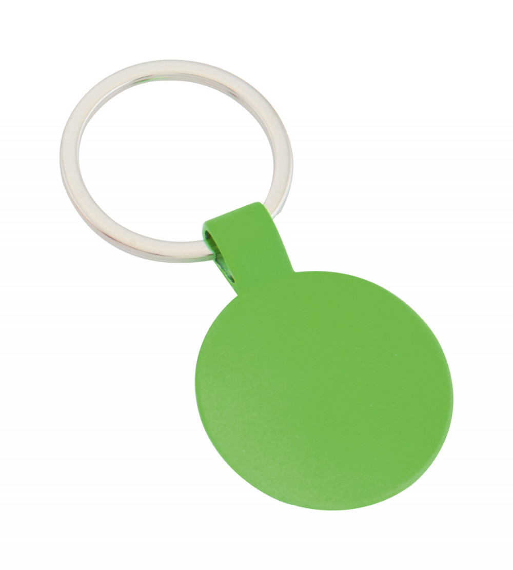 Színes, kerek fém kulcstartó, nagy emblémázható felülettel.