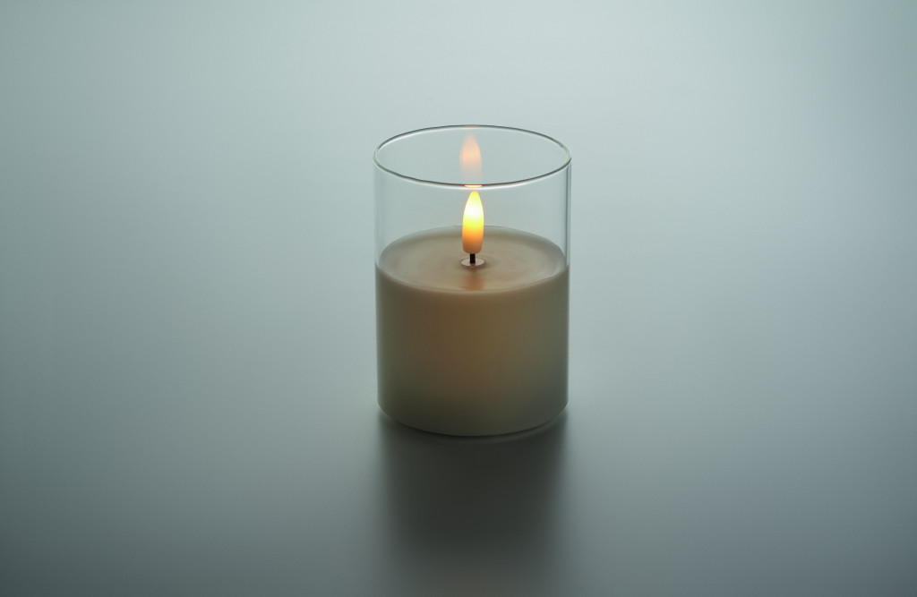 LED-es viaszgyertya üvegtartóban, valós lánghatással. 2 db AA elemmel működik, elem nélkül szállítjuk.