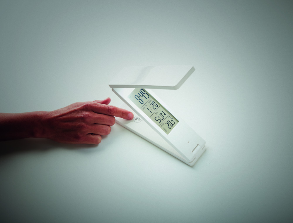 18 ledes összehajtható asztali lámpa ABS. Óra, hőmérő, ébresztés funkciókkal. A működéshez szükséges 1 db CR2032 elemmel szállítjuk.