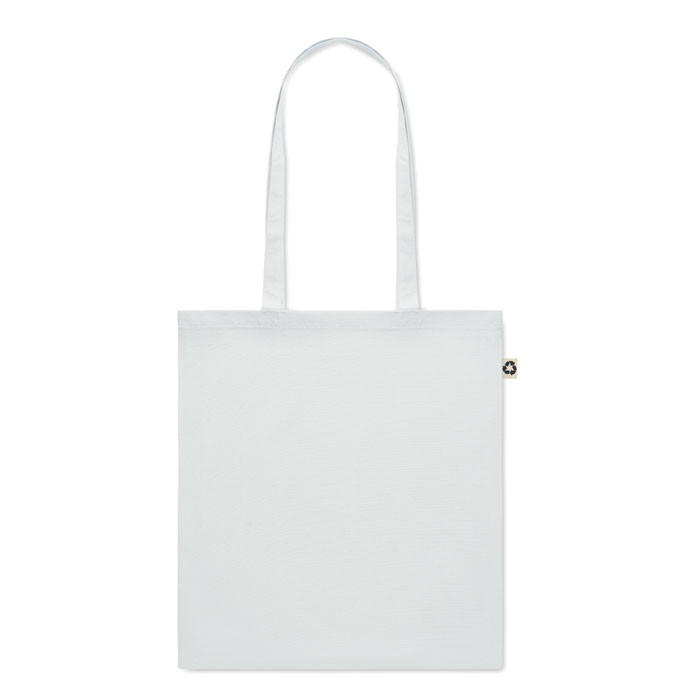 Fogyasztás utáni újrahasznosításból készült pamut bevásárlótáska hosszú fülekkel. 65% újrahasznosított pamut, 35% hagyományos pamut, 140 g vastag anyag.