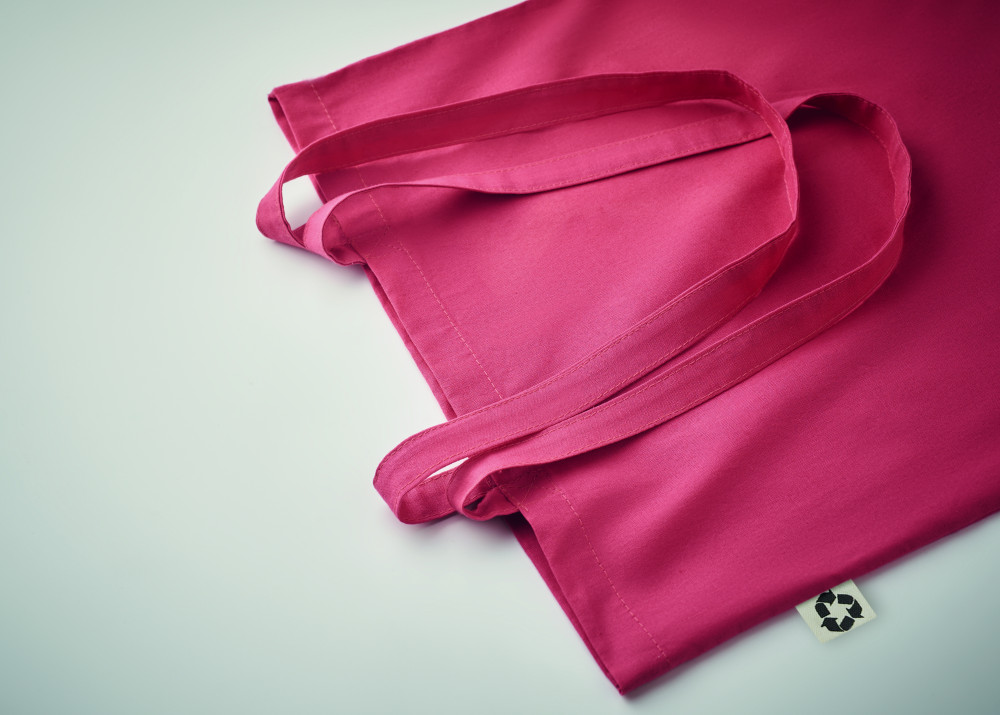 Fogyasztás utáni újrahasznosításból készült pamut bevásárlótáska hosszú fülekkel. 65% újrahasznosított pamut, 35% hagyományos pamut, 140 g vastag anyag.