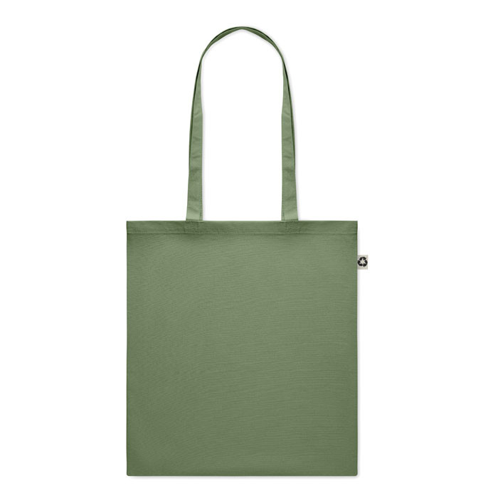 Fogyasztás utáni újrahasznosításból készült pamut bevásárlótáska hosszú fülekkel. 65% újrahasznosított pamut, 35% hagyományos pamut, 140 g vastag anyag.