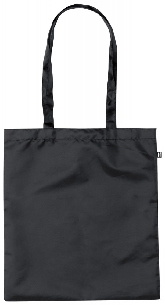 Színes, újrahasznosított anyagból készült bevásárlótáska, hosszú hordfüllel.