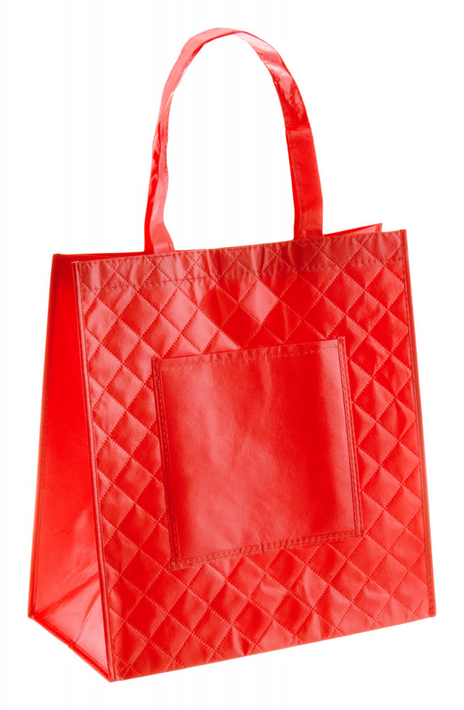 Laminált, non-woven anyagból készült bevásárlótáska kockás mintával és első zsebbel.