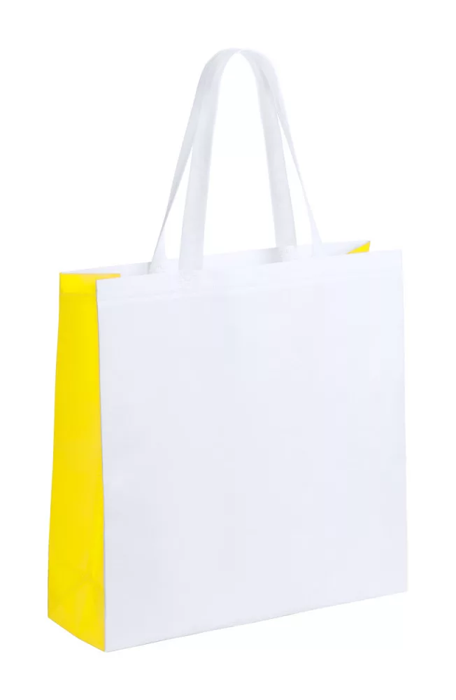 Fehér laminált non-woven anyagból készült bevásárlótáska, színes oldalakkal.
