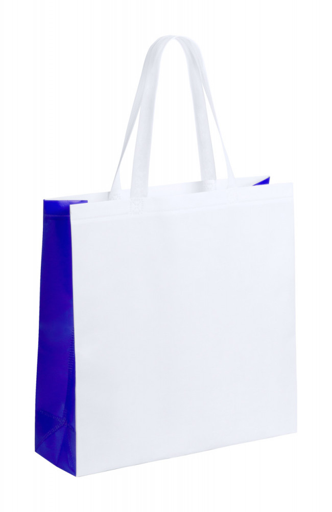 Fehér laminált non-woven anyagból készült bevásárlótáska, színes oldalakkal.