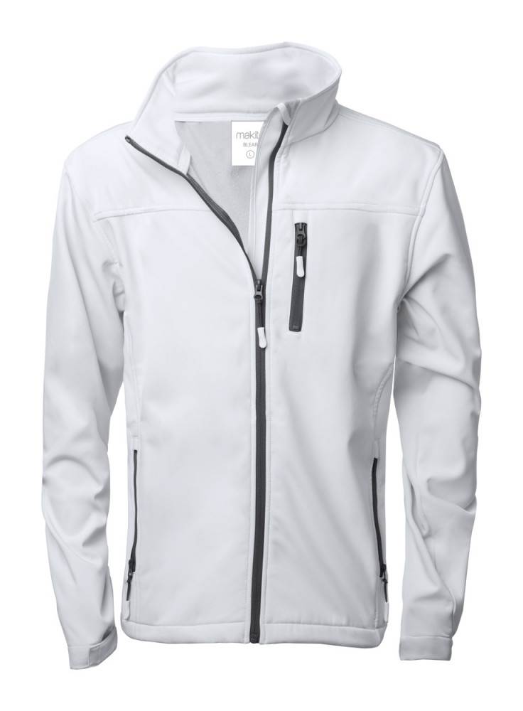 Vízhatlan és légáteresztő, cipzáras softshell kabát 3 zsebbel. 92% poliészter és 8% elasztán keveréke, 300 g/m².