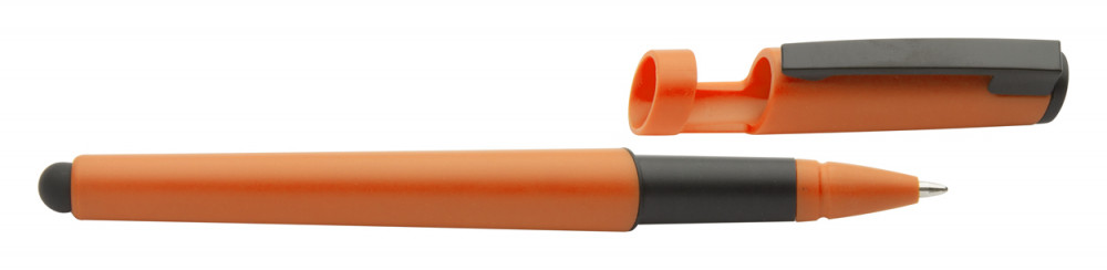 Műanyag golyóstoll érintőképernyős funkcióval, mobiltelefon tartó kupakkal. Kék tollbetéttel szállítjuk.