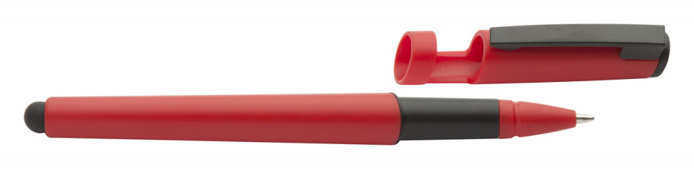 Műanyag golyóstoll érintőképernyős funkcióval, mobiltelefon tartó kupakkal. Kék tollbetéttel szállítjuk.