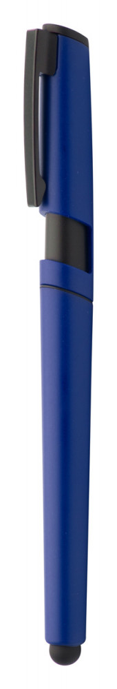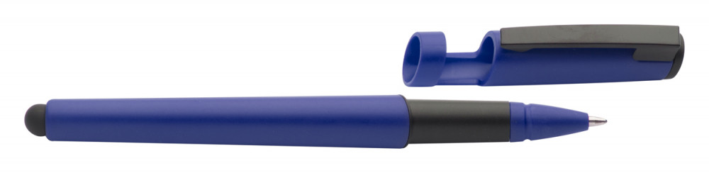 Műanyag golyóstoll érintőképernyős funkcióval, mobiltelefon tartó kupakkal. Kék tollbetéttel szállítjuk.