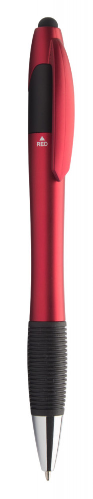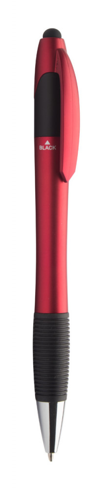 Műanyag golyóstoll érintőképernyős funkcióval, gumi markolattal, króm heggyel és fémes felülettel. Három tollbetéttel szállítjuk: fekete, kék és piros.