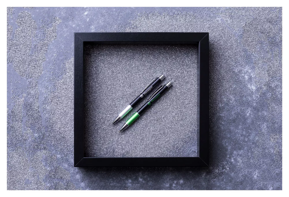 Alumínium golyóstoll speciális borítással, a toll markolatával egyező színű, fényes hatású gravírozáshoz. Kék tollbetéttel.