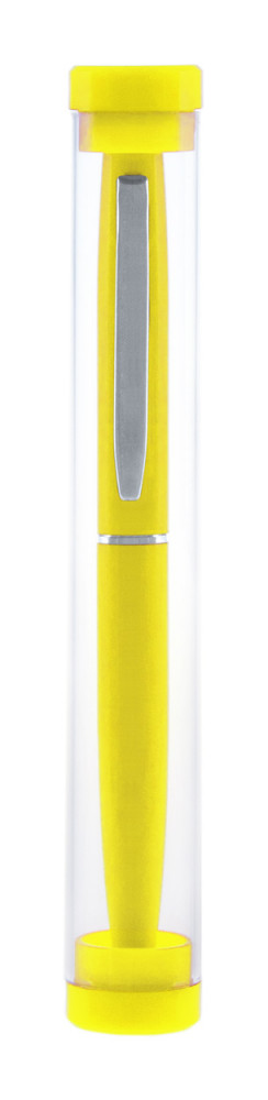 Alumínium golyóstoll, műanyag átlátszó tokban, megegyező színű kupakkal. Kék tollbetéttel szállítjuk.