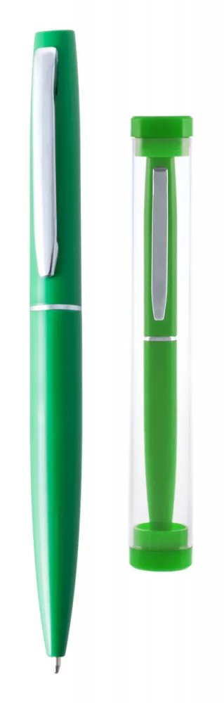 Alumínium golyóstoll, műanyag átlátszó tokban, megegyező színű kupakkal. Kék tollbetéttel szállítjuk.