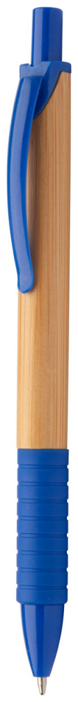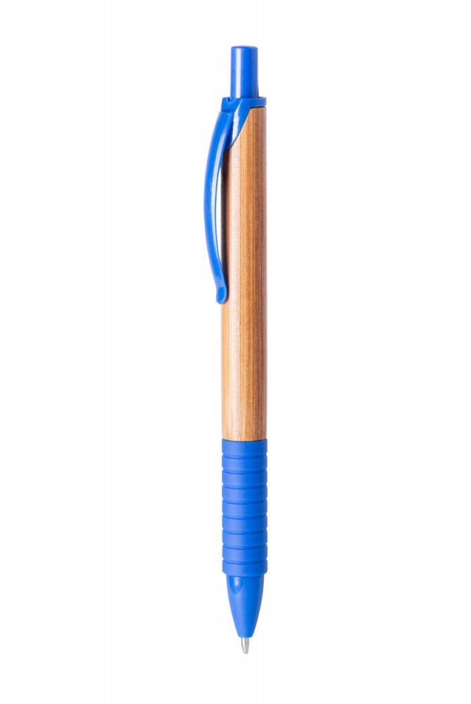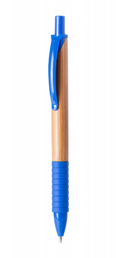 Bambuszból készült golyóstoll, színes gumi markolattal és azonos színű műanyag klipsszel. Kék tollbetéttel szállítjuk.