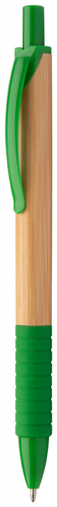 Bambuszból készült golyóstoll, színes gumi markolattal és azonos színű műanyag klipsszel. Kék tollbetéttel szállítjuk.