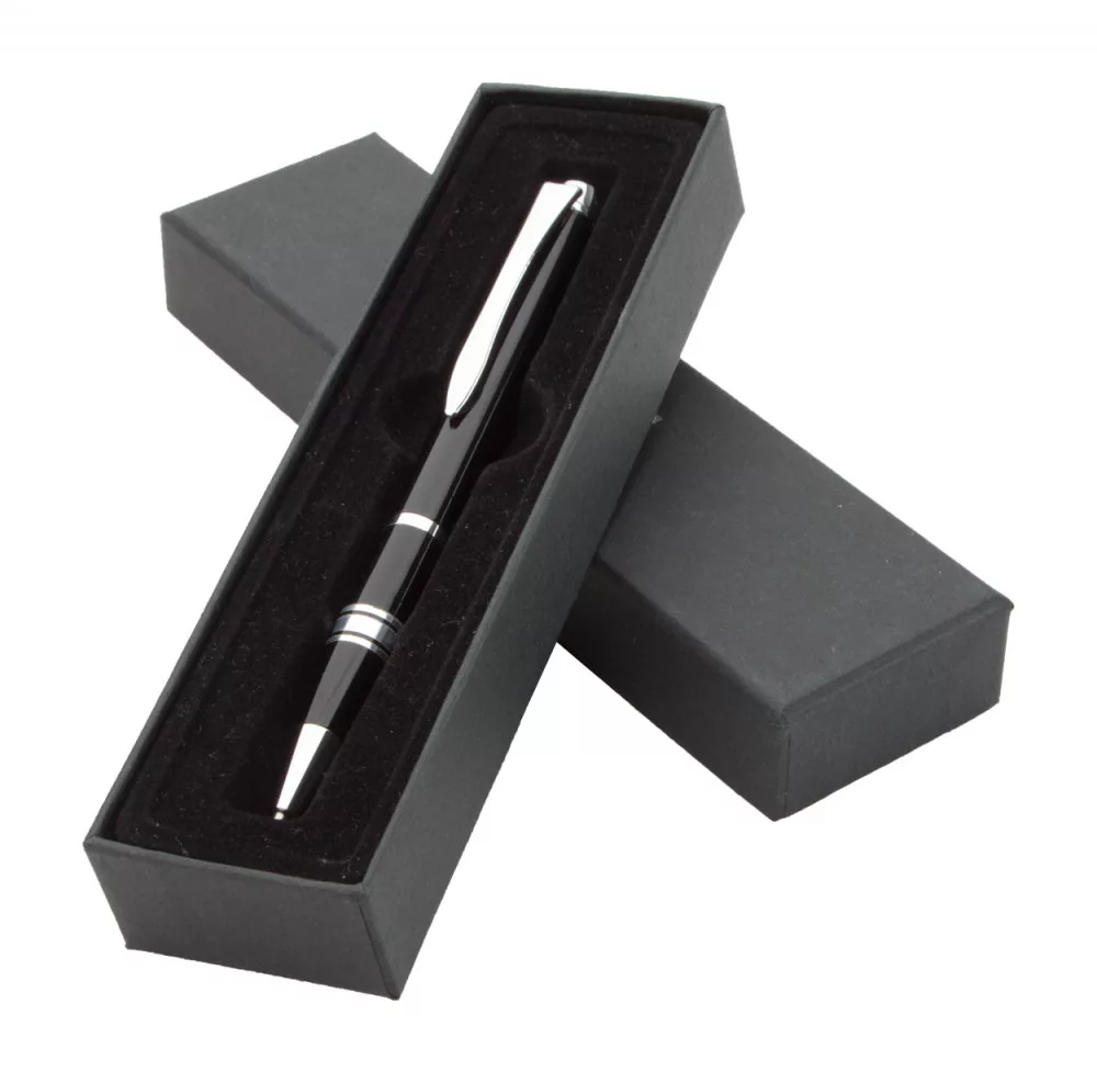 Elegáns, fém golyóstoll, lakkozott, fényes króm részekkel. Díszdobozban, kék tollbetéttel szállítjuk.