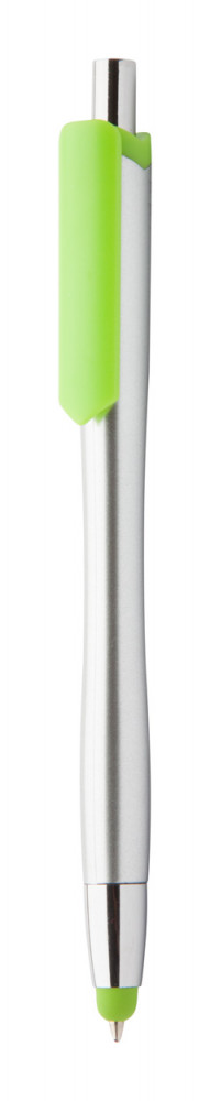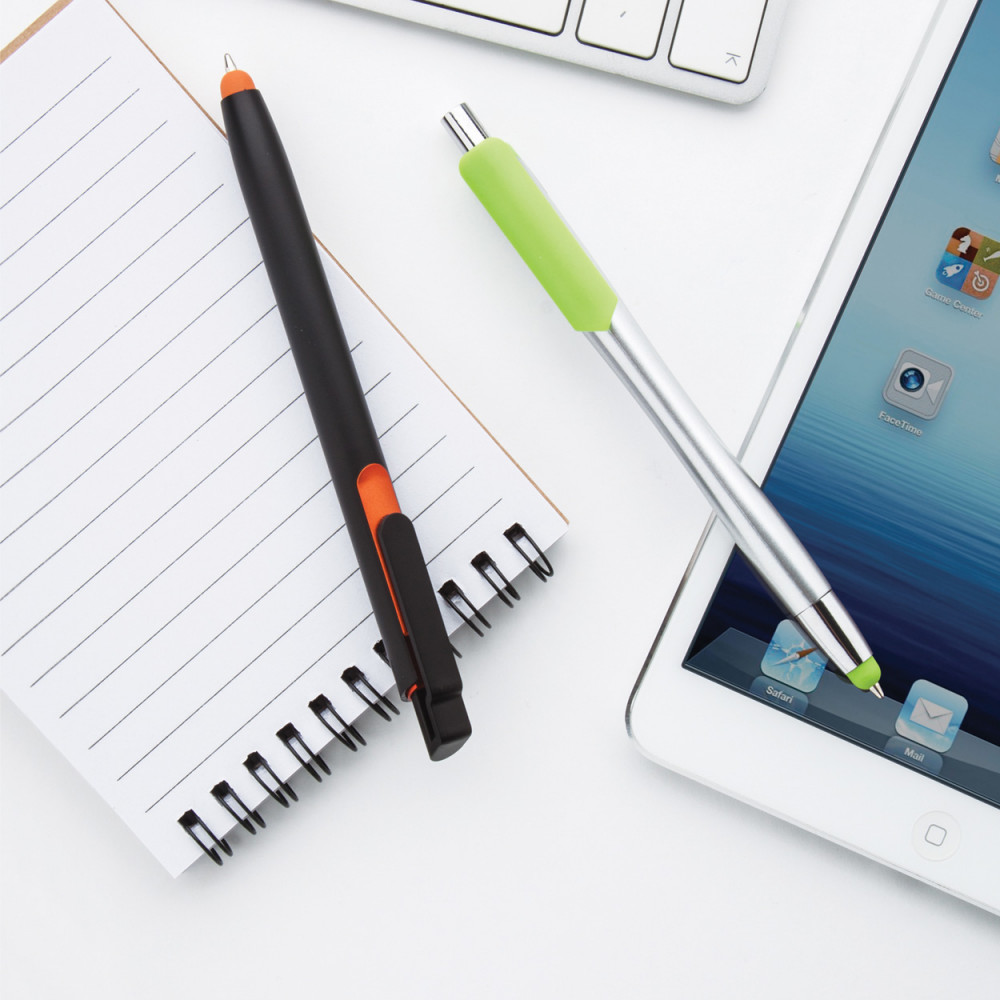 Műanyag golyóstoll érintőképernyős funkcióval, ezüst testtel, színes gumi résszel és klipsszel. Kék tollbetéttel szállítjuk.
