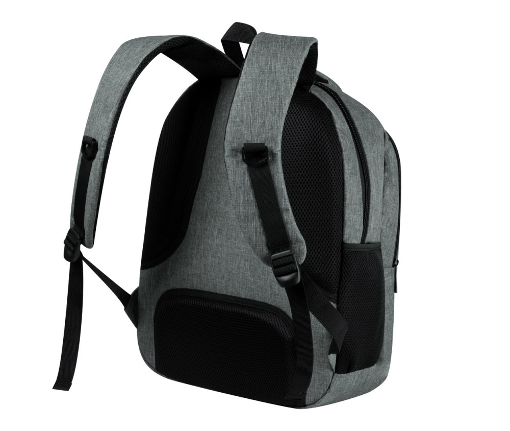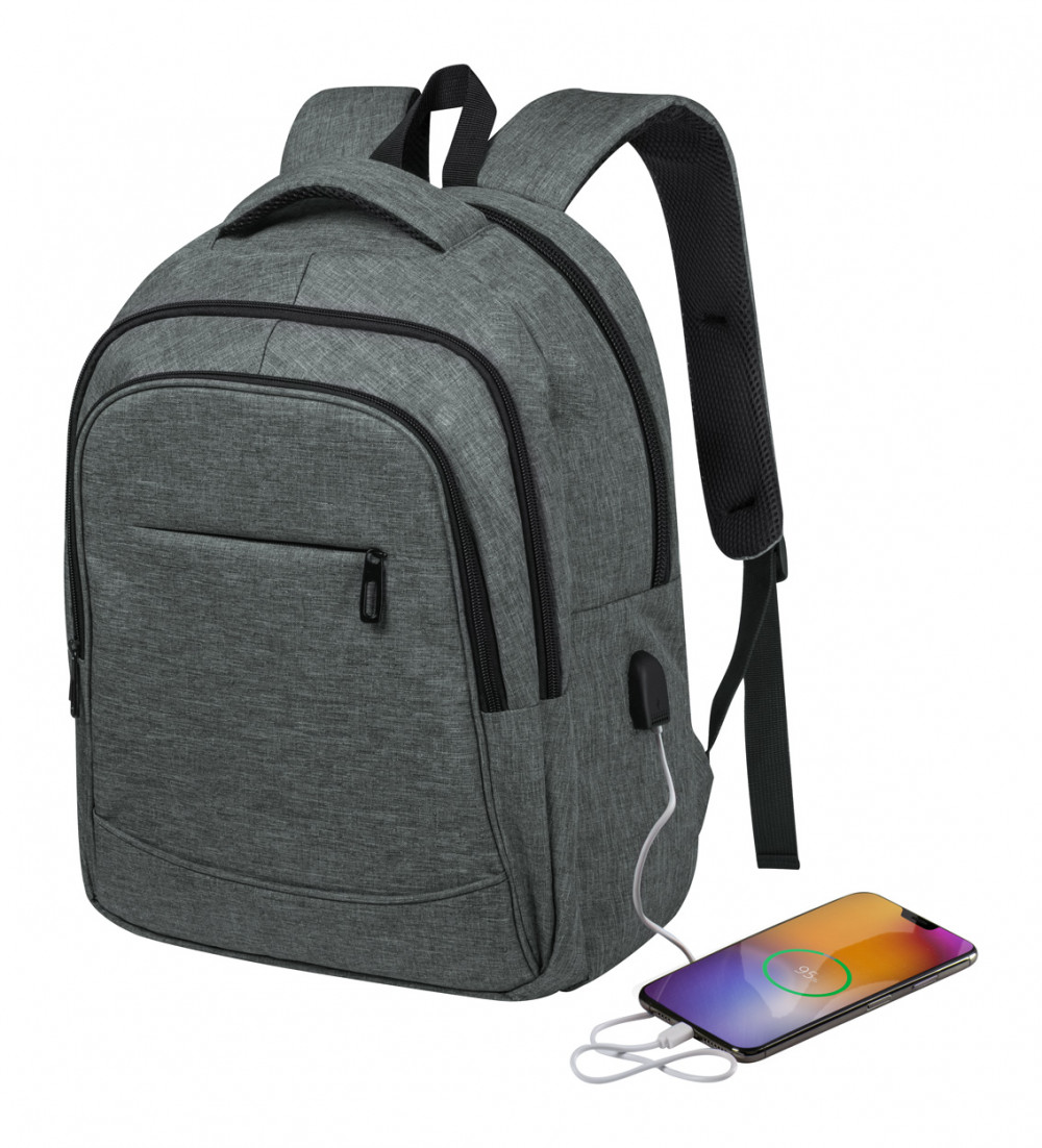 Hátitáska több cipzáras rekesszel, bélelt laptop- és tablettartó rekesszel, ergonomikus pántokkal és oldalzsebekkel. Beépített USB csatlakozóval power bankokhoz. 600D poliészter.