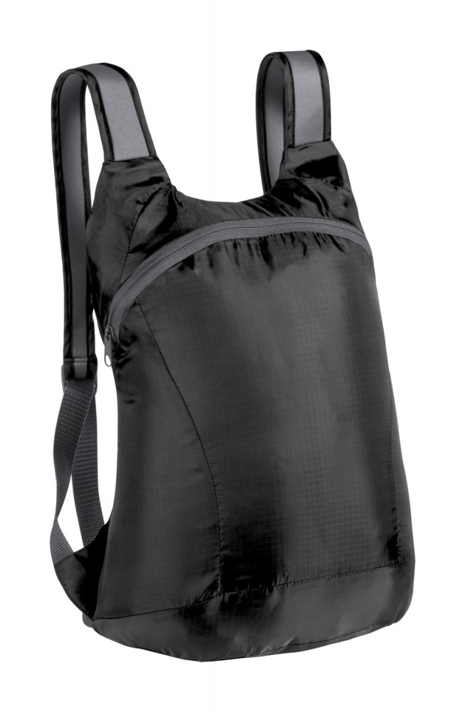 Összehajtható ripstop hátizsák cipzáras rekesszel, állítható vállpánttal, karabinerrel és megegyező színű tokkal.
