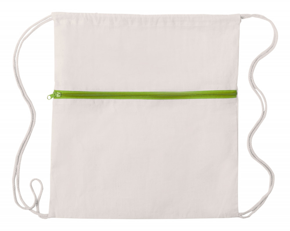 100% pamut hátizsák zsinórfüles vállpánttal és színes cipzáras első zsebbel, 100 g/m².
