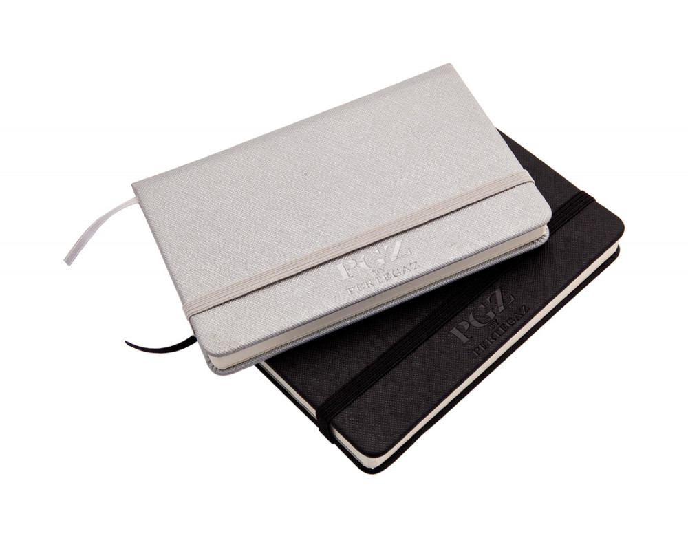 Műbőr borítású jegyzetfüzet 80 üres oldallal és gumi szíjjal.