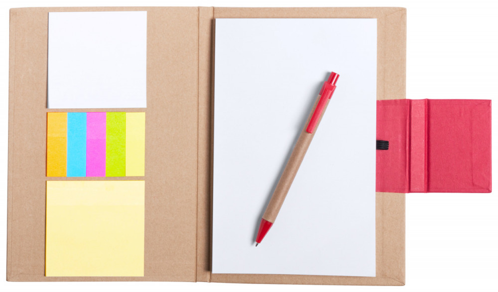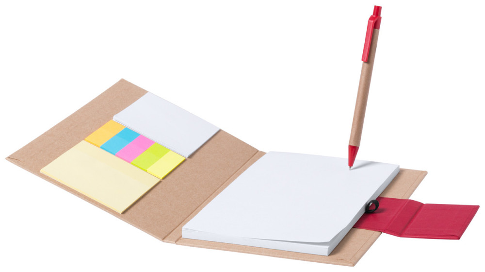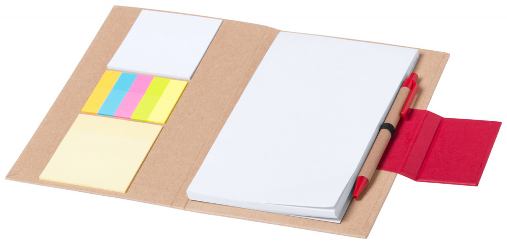 Újrahasznosított papírból készült 50 lapos jegyzetfüzet, újrahasznosított papírból készült golyóstollal. Tartalmaz 2 különböző méretű öntapadós jegyzettömböt is (30 db 73×75 mm és 75 darab 15 x 50 mm).
