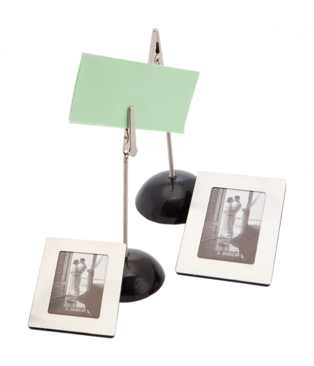 Mágneses képkeret jegyzetcsipesszel, színes műanyag talpon.
