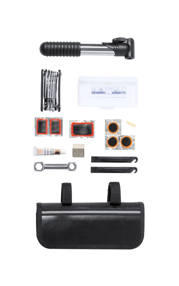 Kerékpár javító készlet praktikus tokban. Tartalmaz: 15 funkciós eszközt, hatszögletű csavarkulcsot, mini pumpát és defektjavító készletet (2 köpenyleszedőt, reszelőt és 6 tapaszt). 600D poliészter.