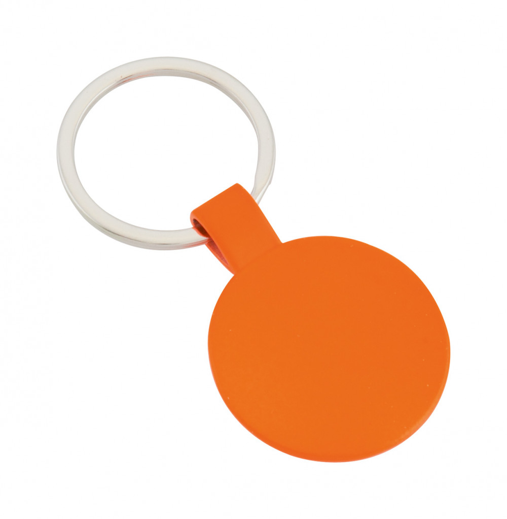 Színes, kerek fém kulcstartó, nagy emblémázható felülettel.