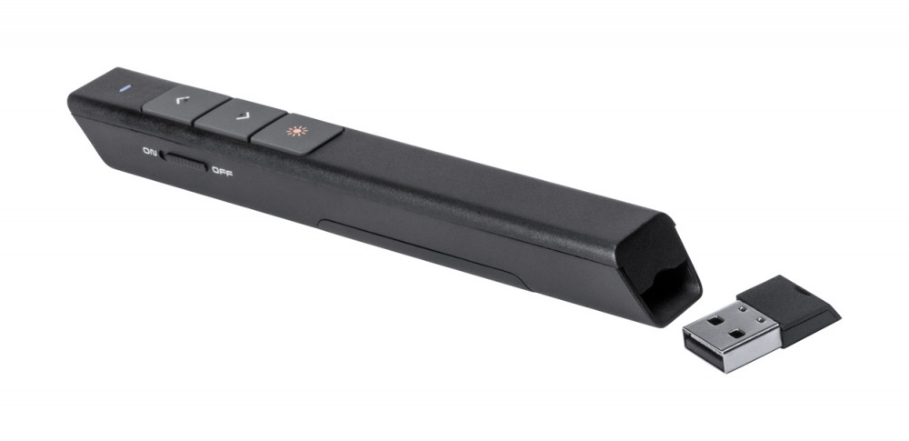 Műanyag borítású lézermutató LED világítással és előadás vezérlő funkcióval. Ajándék papír dobozban és 1 db AAA elemmel szállítjuk.
