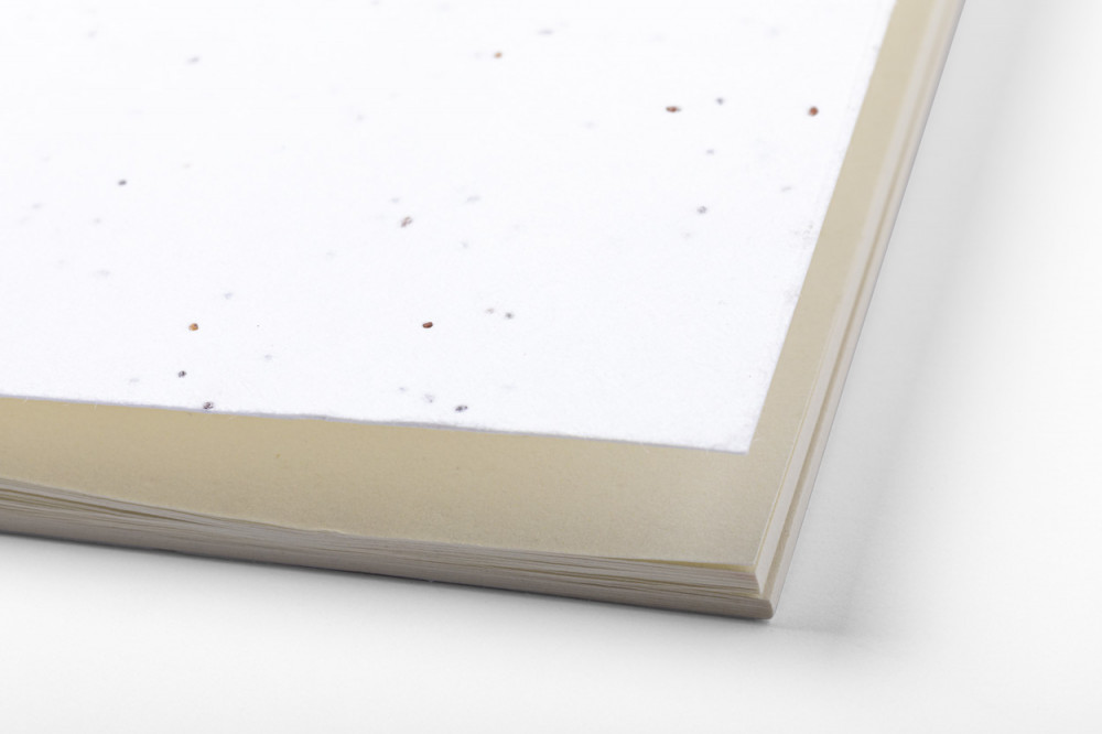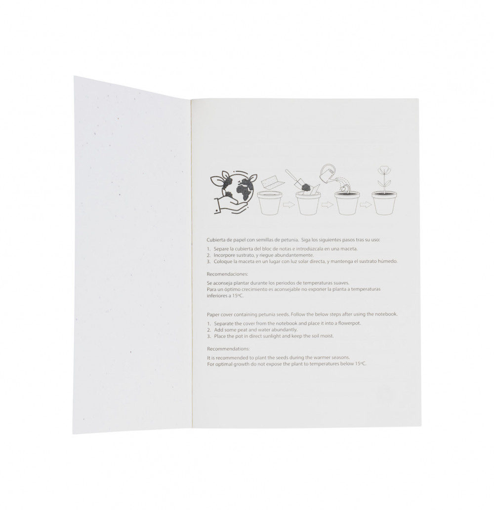 Jegyzetfüzet magpapír borítóval és 40 sima lappal. A magpapír borító különböző vadvirág magokat tartalmaz, amelyeket a borítót a füzetről leválasztva lehet elültetni. Kraft papírgyűrűben.