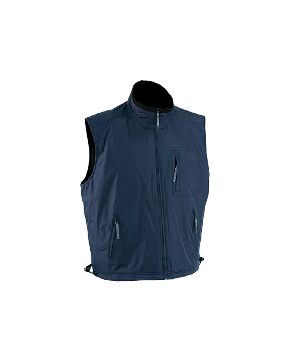 100% poliészter, állógalléros, cipzáras mellény, kontrasztos színű polár belsővel. Elején és két oldalán cipzáras zsebbel. Mellény alja bősége gumizsinórral szabályozható. 280 g/m².