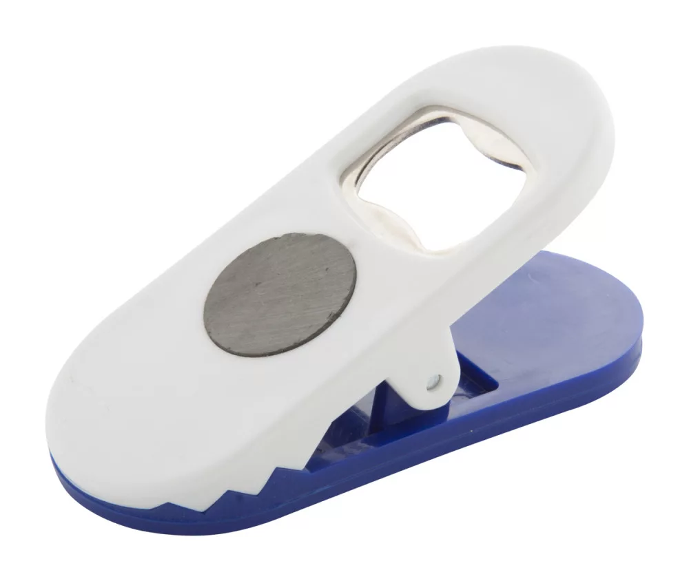 Műanyag üveg nyitó, jegyzet csipesszel és mágnessel.