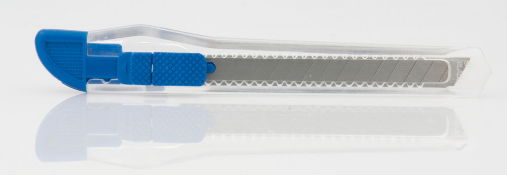 Kicsi, műanyag papírvágó kés átlátszó borítással.