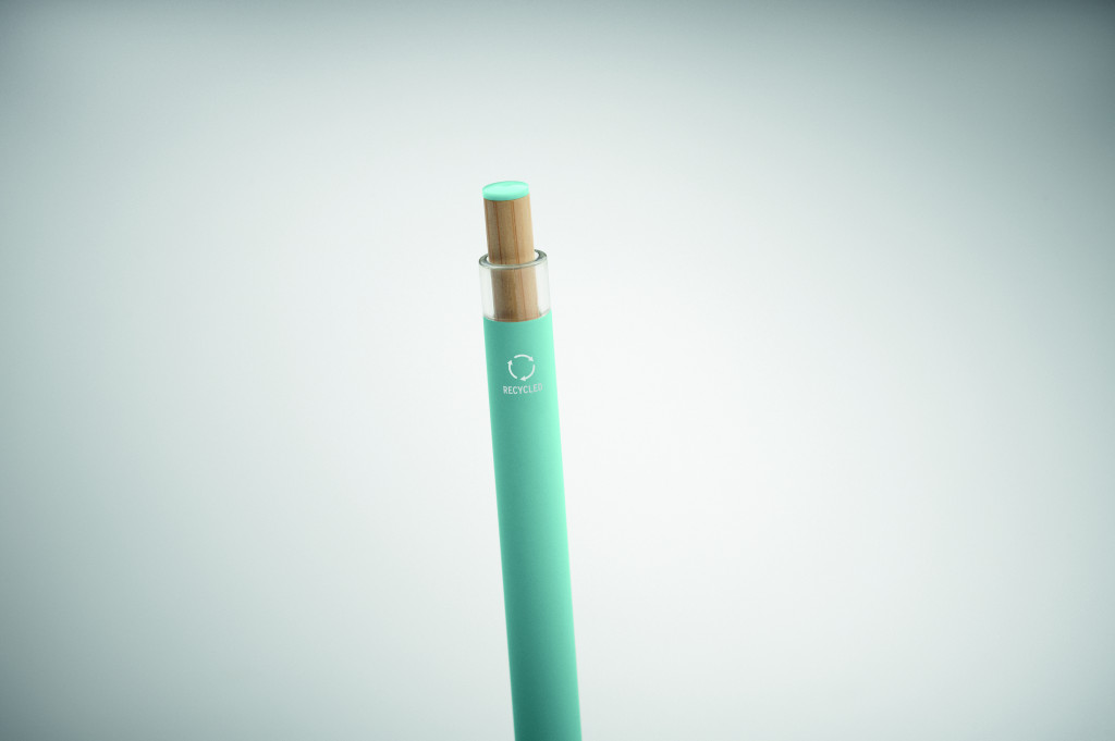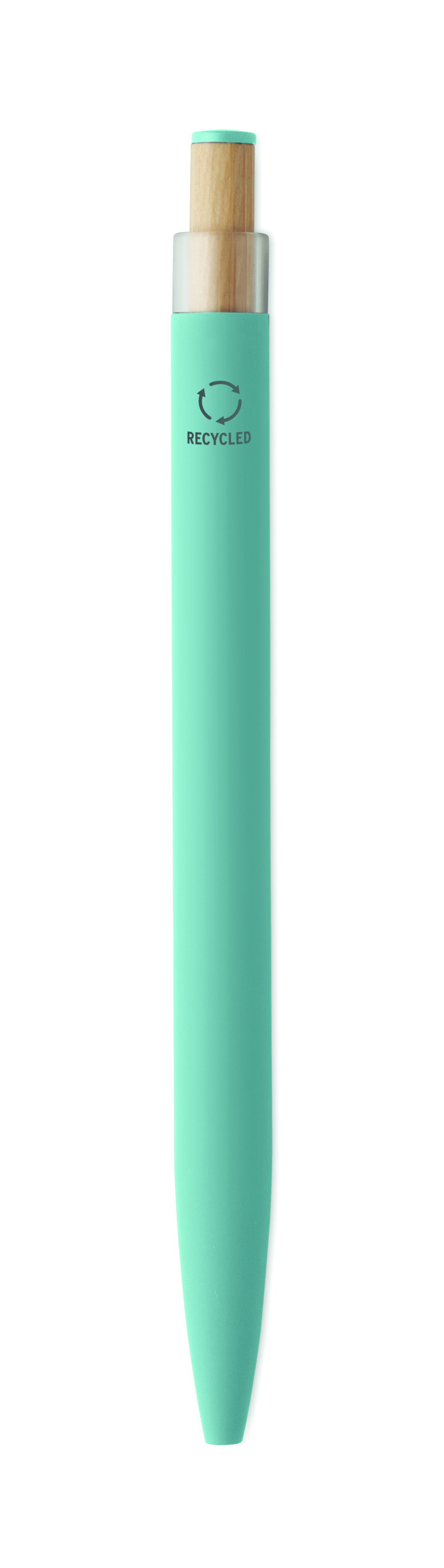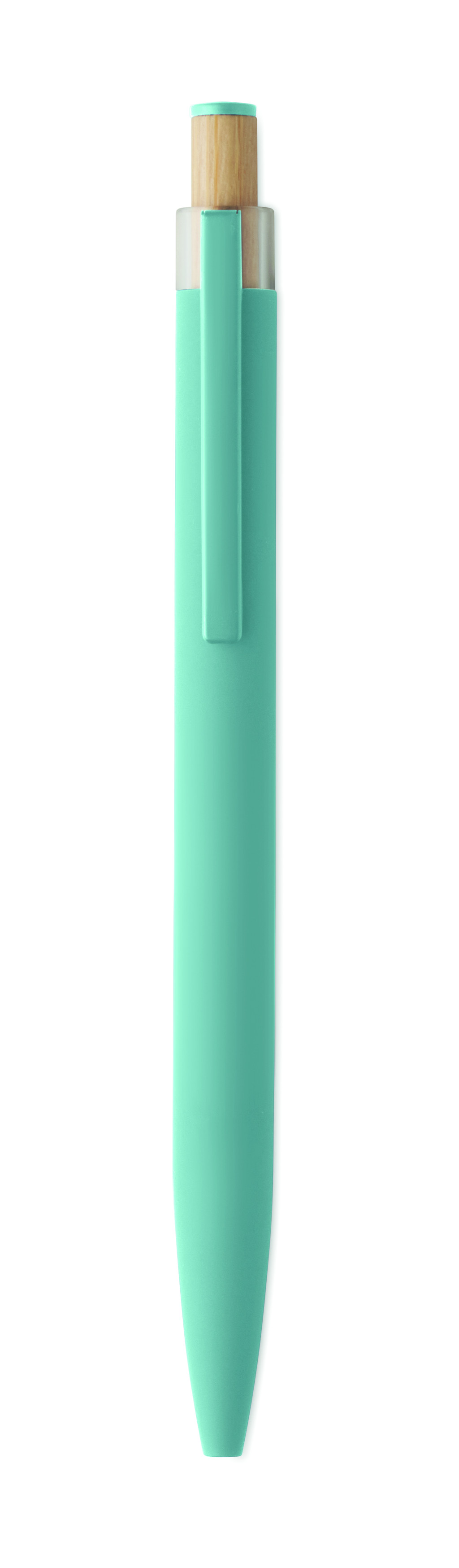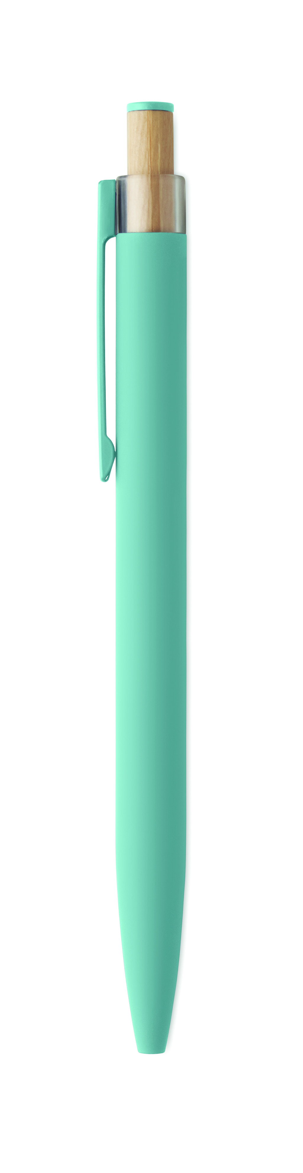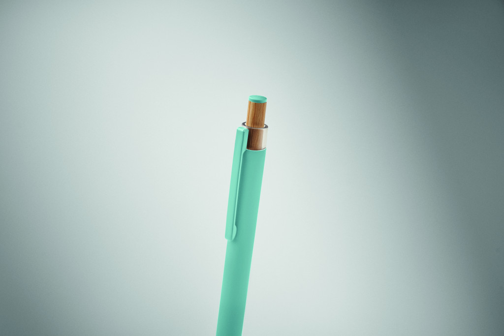 Újrahasznosított alumínium golyóstoll, színazonos tetejű, bambusz nyomógombbal, színazonos fém csíptetővel. Kéken író betéttel.
