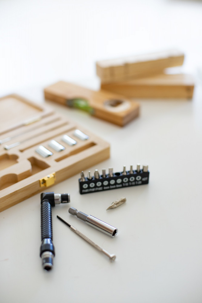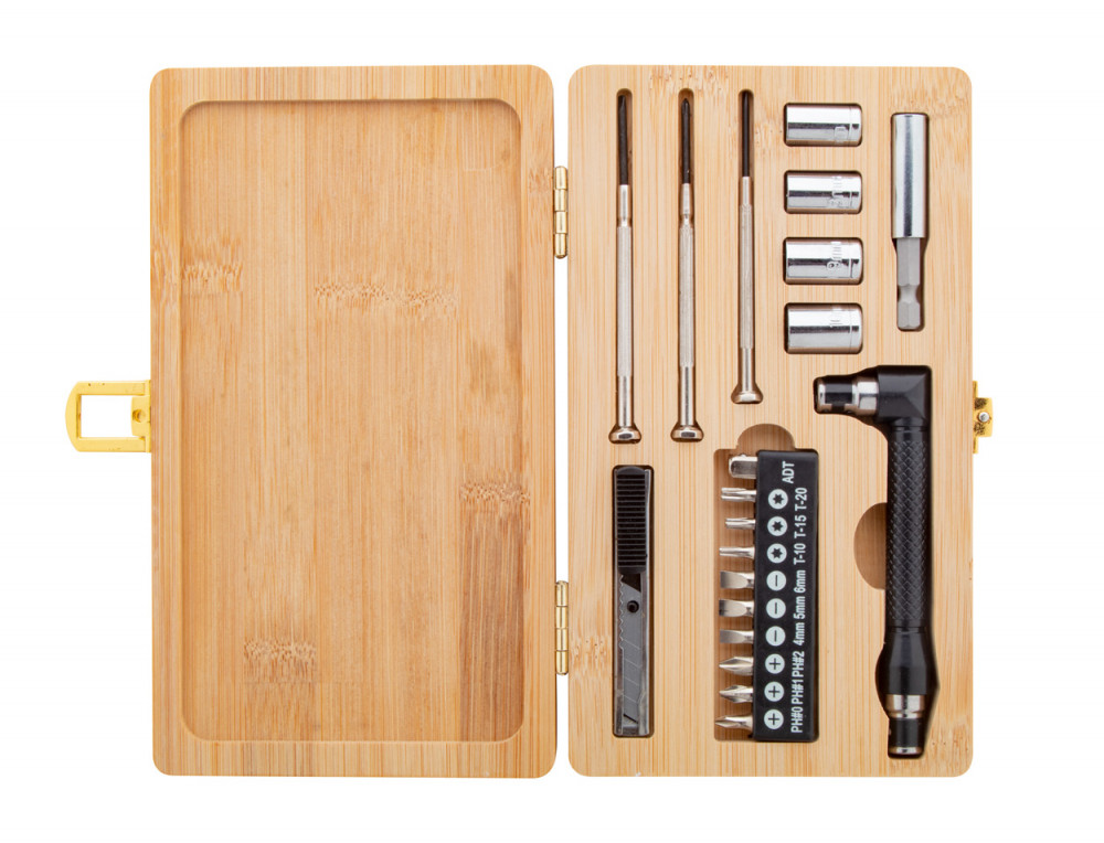 21 darabos szerszámkészlet bambusz dobozban. 1 csavarhúzó markolatot, 1 papírvágó kést, 3 precíziós csavarhúzót, 10 bitfejet tartóban, 4 darab dugókulcs fejet és 1 hosszabbítót tartalmaz.