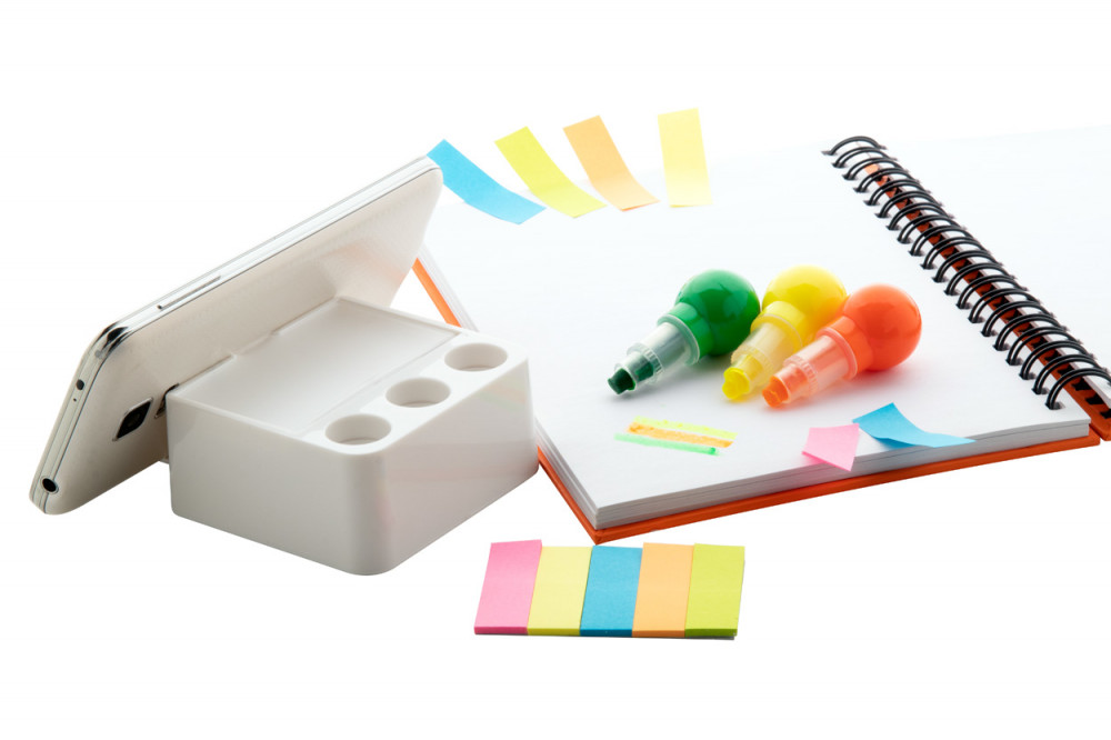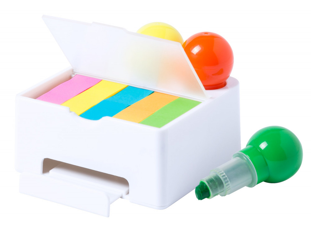 Jelölőcsík szett áttetsző tartóban, 3 színű szövegkiemelővel, öntapadós jegyzetlappal (100 db 12 x 38 mm) és mobiltelefon tartóval.