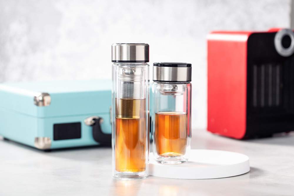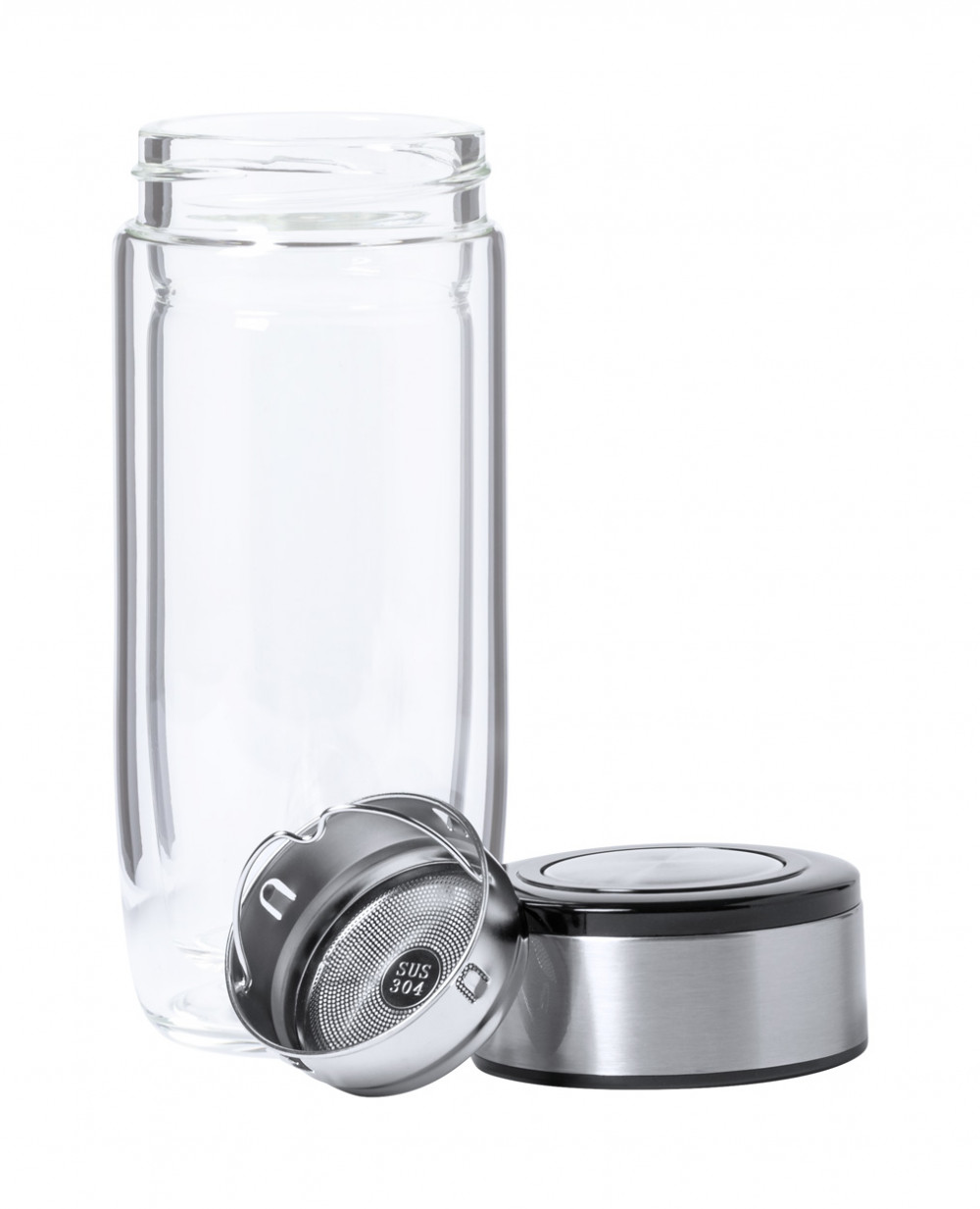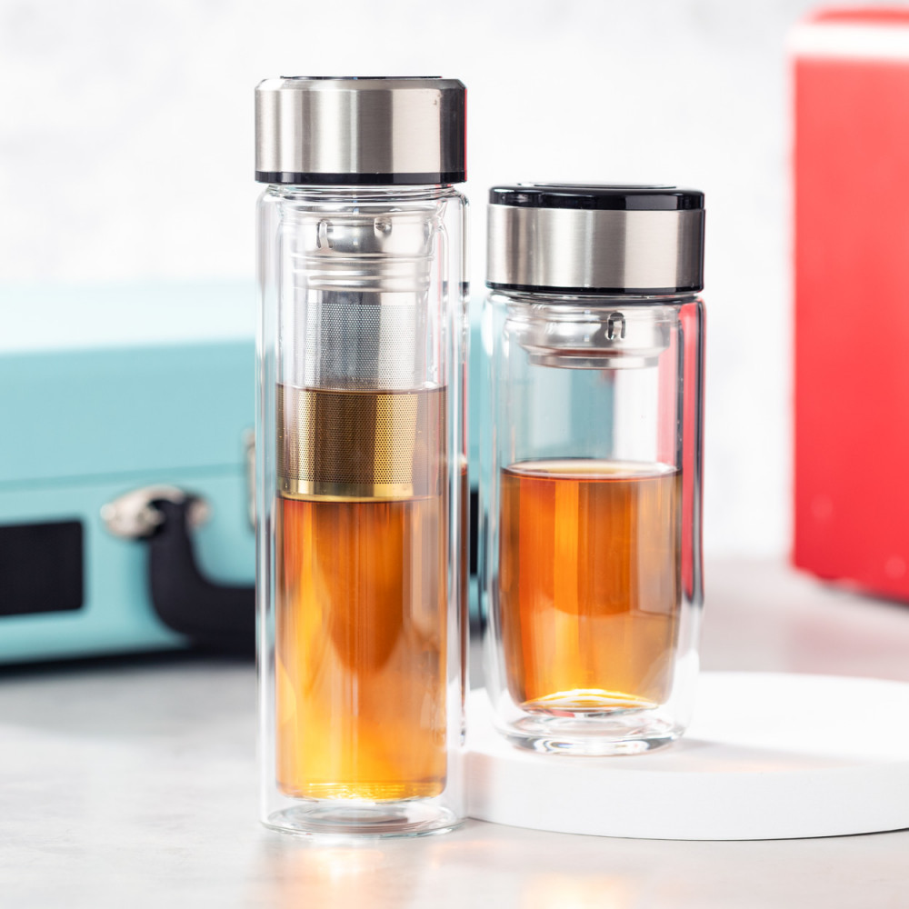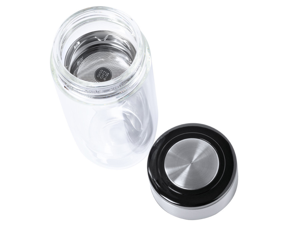 Duplafalú boroszilikát üveg thermo bögre teafűtartóval és rozsdamentes acél fedővel. 330 ml.
