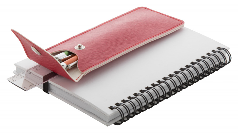 Műbőr tolltartó elasztikus gumival, melynek segítségével könnyen rögzíthető jegyzetfüzetre vagy mappára.