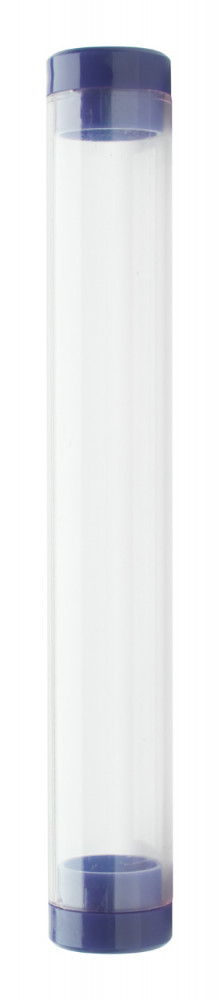 Átlátszó műanyag, henger alakú tolltartó, színes zárókupakokkal.