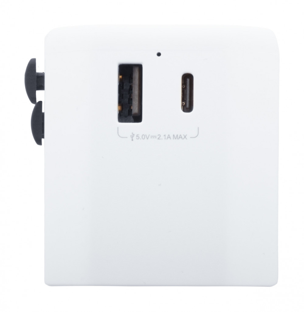 Univerzális, ABS műanyagból készült úti adapter, USA, EU, UK és Ausztrália szabványainak megfelelő csatlakozókkal. 1 USB és 1 USB-C csatlakozással.