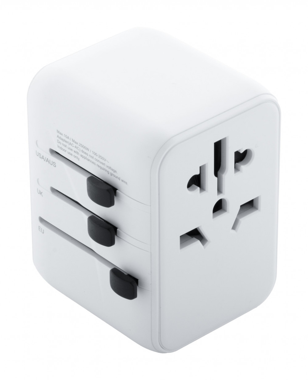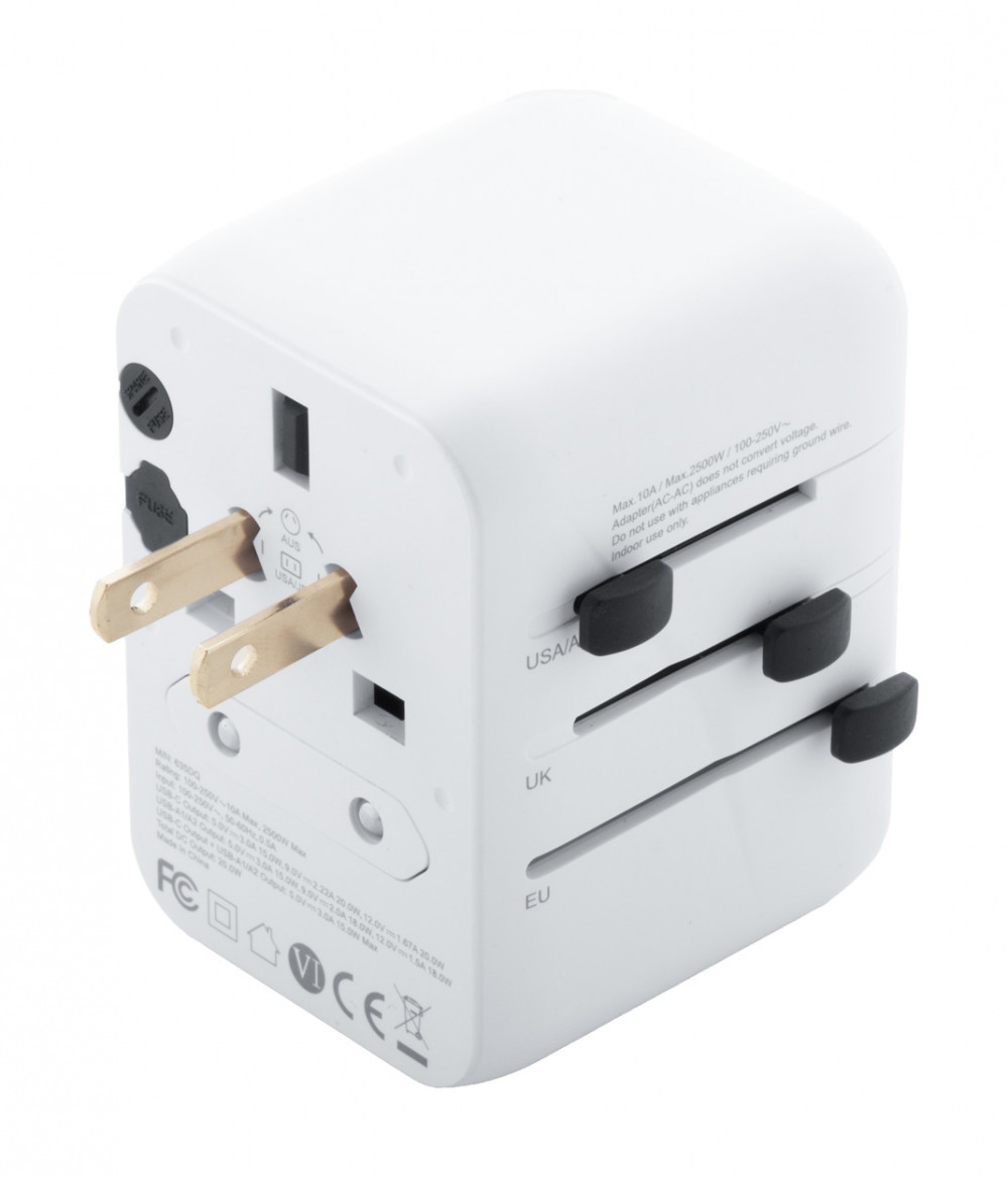 Univerzális, ABS műanyagból készült úti adapter, USA, EU, UK és Ausztrália szabványainak megfelelő csatlakozókkal. 2 USB és 1 USB-C csatlakozással. Gyorstöltő technológiával (PD20W).