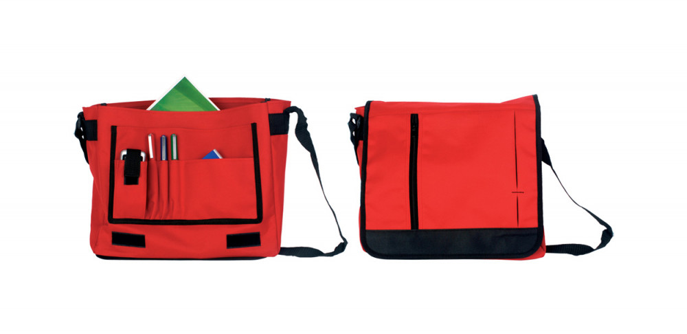 Cipzáras oldaltáska, a tépőzáras lehajtható részén cipzáras zsebbel, állítható vállpánttal. Anyaga:600D poliészter.