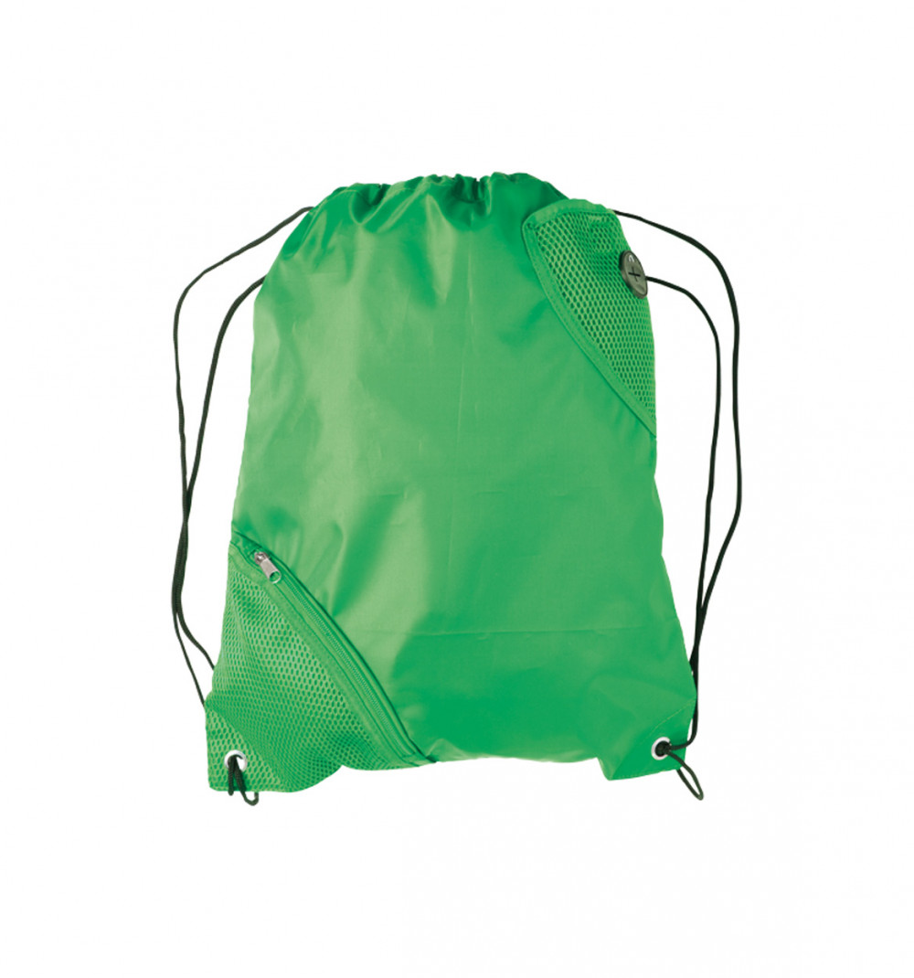Zsinórral összehúzható hátizsák, cipzáras zsebekkel. Anyaga: 210D poliészter.