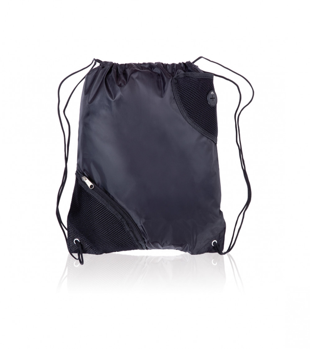 Zsinórral összehúzható hátizsák, cipzáras zsebekkel. Anyaga: 210D poliészter.